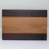 Handmade from a mix of four high-quality, solid hardwood species – Oak, Walnut, Hickory, Padouk – with angled side mount black handles for secure handling. Designed for premium function, durability, and beauty.